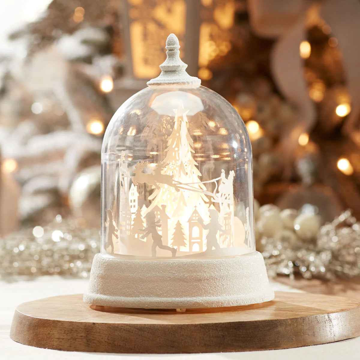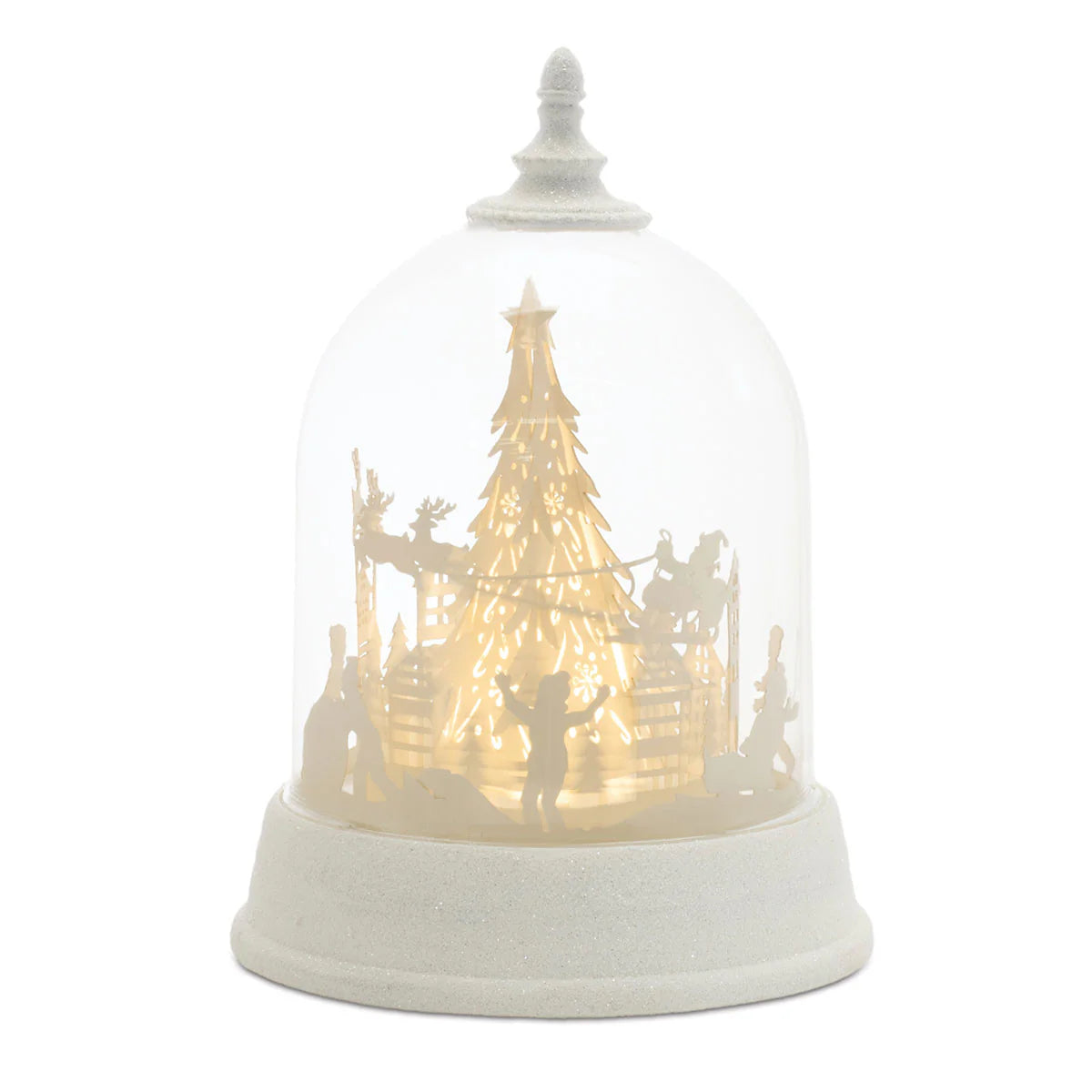 Bring the wonder of Christmas Eve into your home with the LED Rotating Santa’s Sleigh Globe. This whimsical décor piece features Santa and his reindeer flying around a beautifully lit Christmas tree inside a wintry white bell jar globe. The LED lighting casts a warm, inviting glow, while the rotating design adds motion and magic to your seasonal display. With a 6-hour timer and dual power options—USB cord (included) or 3 AA batteries (not included)—it’s perfect for tabletops, shelves, or mantels, complementing festive figurines and holiday arrangements.